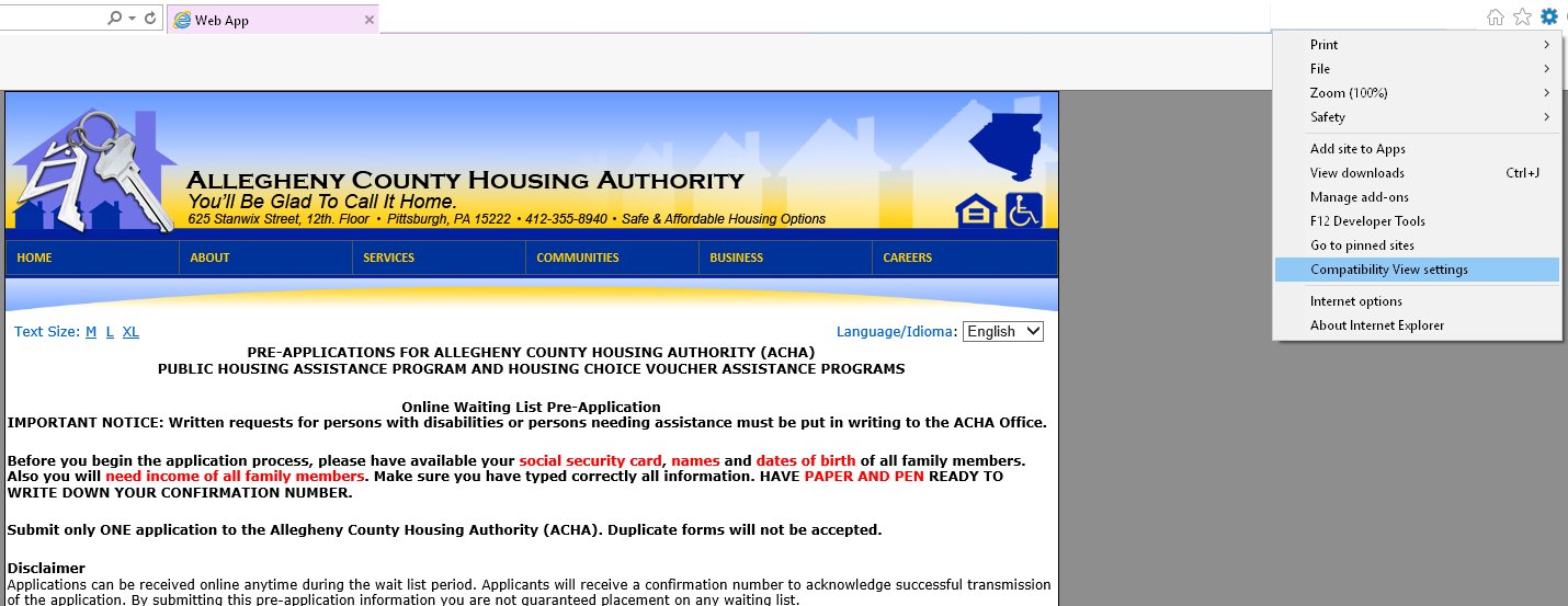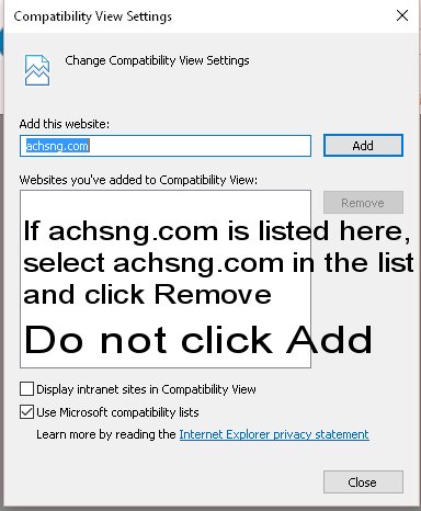 In the Compatibility View Settings window, if achsng.com is in the 'Websites you've added to Compatibility View' pane, click on achsng.com and click Remove. Click the "Close" button (see figure 2). The page should now refresh with the new settings and all the links and features will work.